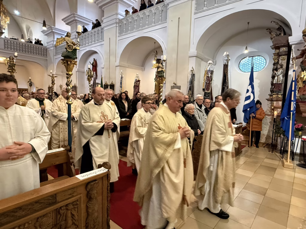Angeführt von den Schlossbergern marschierte zunächst ein langer Kirchenzug mit den Vertreterinnen und Vertretern der Markt- und Pfarrgemeinden Eslarn und Moosbach, sowie vielen Vereinen aus der gesamten Pfarreiengemeinschaft zur Eslarner Pfarrkirche Mariä Himmelfahrt. Anschließend zog der liturgische Dienst ebenfalls zum Hauptportal, wo die beiden PGR-Sprecherinnen Agnes Härtl und Elisabeth Völkl jeweils ein kurzes Grußwort an Dekan Hösl und Pfarrer Klösel richteten. Danach zogen die Ministrantinnen und Ministranten sowie die Geislichen mit einer Fanfare, die das Blechbläser-Ensemble Moosbach intonierte, in das Gotteshaus ein. Nach dem Eröffnungslied „Wer glaubt ist nie allein“ sprach Pfarrer Udo Klösel ein kurzes Gebet an den Altarstufen, dann führte Dekan Alexander Hösl in die Feier ein.