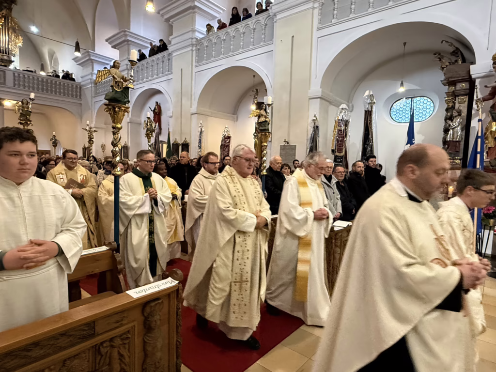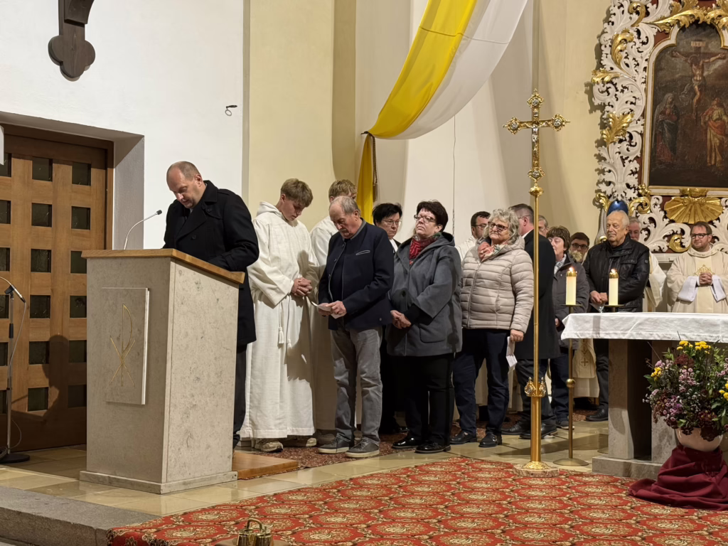 Wie schon die Lesungen, so wurden auch die Fürbitten von Lektorinnen und Lektoren aus Eslarn und Moosbach vorgetragen. Danach sang der Kirchenchor Eslarn zur Gabenbereitung das Mottolied zum Heiligen Jahr 2025 „Pilger der Hoffnung“, ehe Pfarrer Udo Klösel als offiziell installierter Seelsorger der Pfarreiengemeinschaft Eslarn-Moosbach der Eucharistie vorstand.