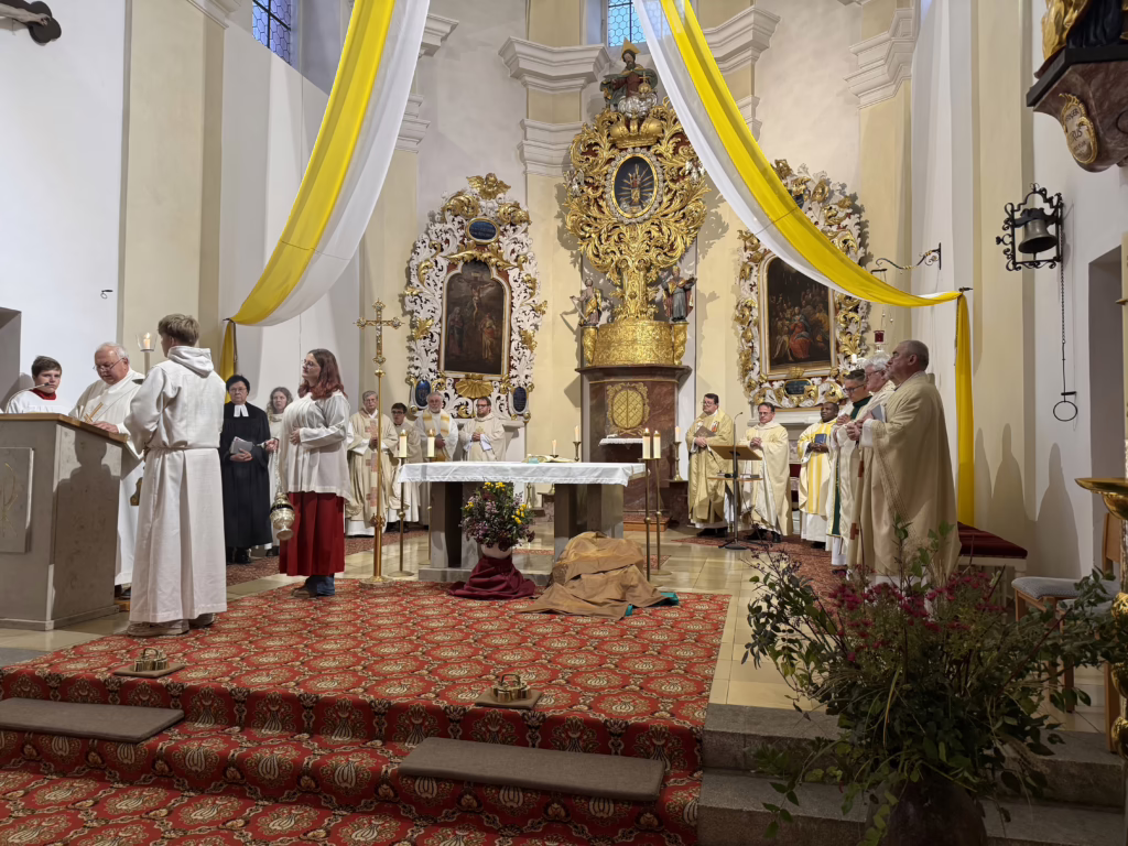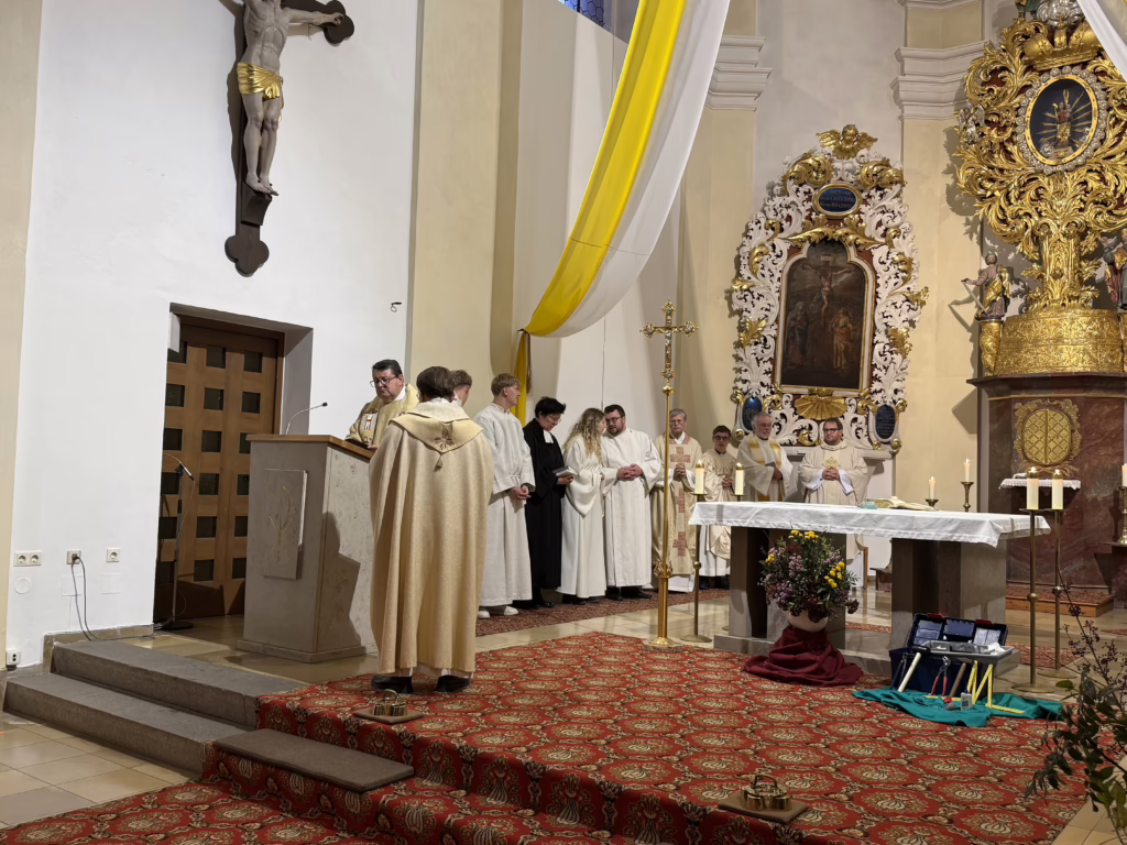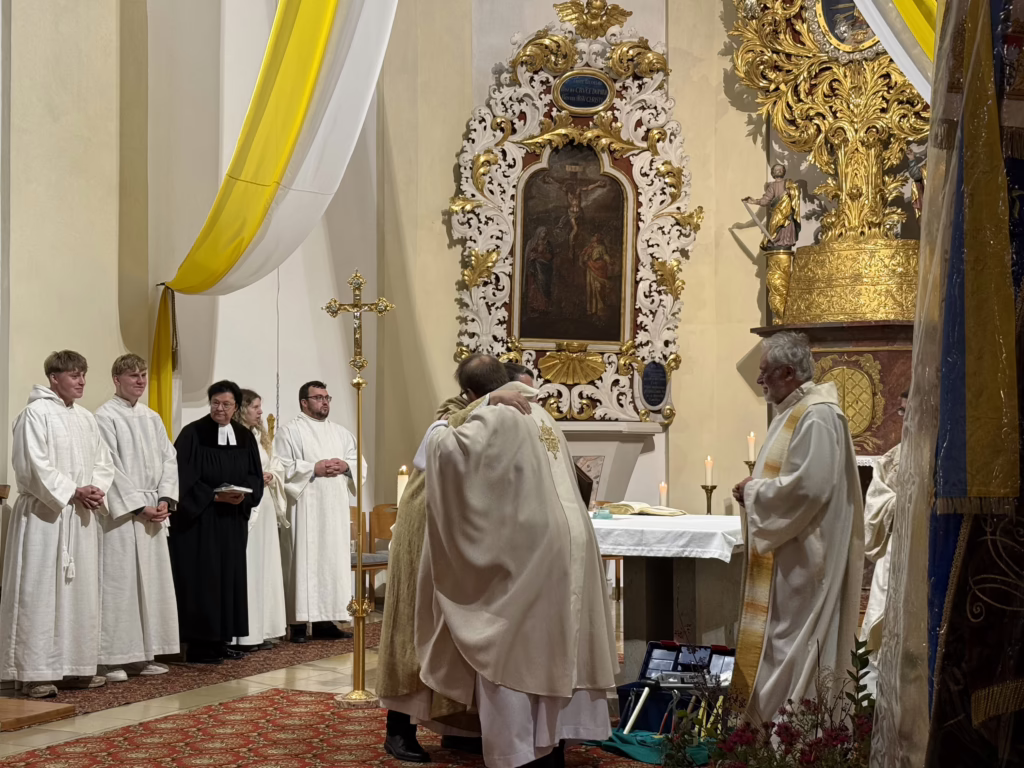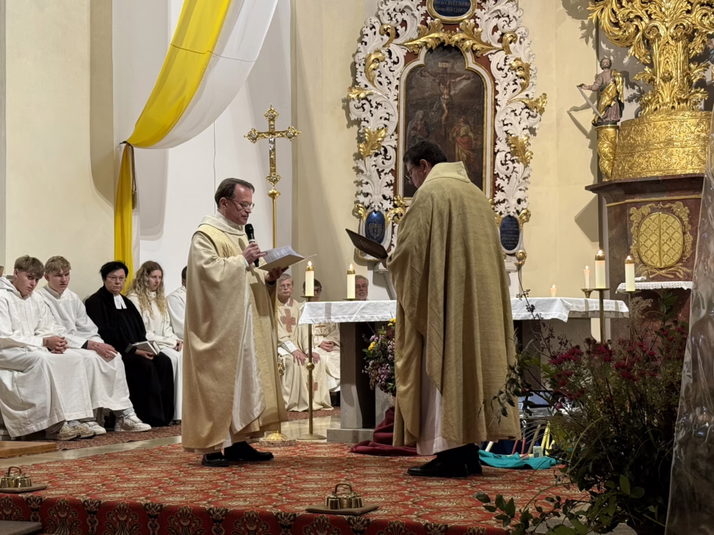 Nach der Predigt, in der Dekan Alexander Hösl auch den neuen Gemeindereferenten Benedikt Eckert willkommen hieß, erfolgte die offizielle Installation von Pfarrer Udo Klösel. Nachdem dieser sein priesterliches Bereitschaftsversprechen abgelegt und man im gemeinsamen Lied den Beistand des Heiligen Geistes erbeten hatte, führte Dekan Hösl Pfarrer Klösel zum Priestersitz, zum Ambo und zum Altar – und übertrug ihm so offiziell die Seelsorge in der Pfarreiengemeinschaft Eslarn-Moosbach. Danach erfolgte der Friedensgruß durch Dekan Alexander Hösl und die anderen anwesenden Geistlichen. Neben Pfarrvikar Basil und Diakon Herbert Sturm, die ja zum Seelsorgeteam der Pfarreiengemeinschaft gehören, waren vom Dekanat Neustadt-Weiden Prodekan Daniel Fenk (Grafenwöhr), Pfarrer Norbert Götz (Waldthurn), Pfarrer Adam Karolczak (Pleystein) sowie Pfarrer Edmund Prechtl gekommen, der ja Pfarrer der Heimatpfarrei Pressath ist. Von dort stammen auch Kolping-Diözesanpräses Karl-Dieter Schmidt und der Oberviechtacher Pfarrer Alfons Kaufmann. Als Priester aus der Pfarreiengemeinschaft waren P. Felix Meckl OSA (Maria Eich) und Kaplan Michael Steinhilber (Bad Kötzting) vertreten. Als zweiter Diakon stand Johannes Theisinger aus Regenstauf mit am Altar, Geschäftsführer des Diözesanverbandes der KLJB.