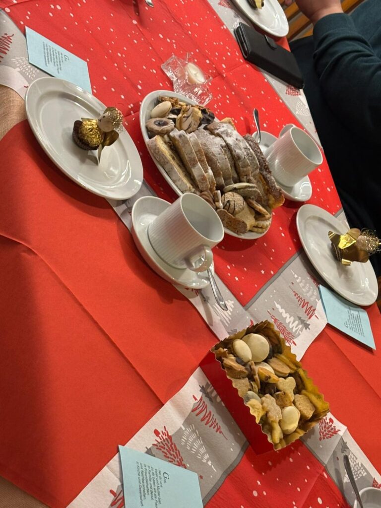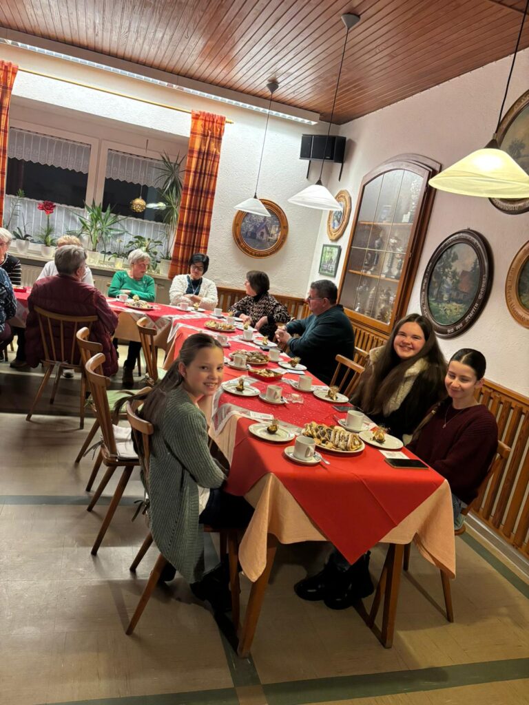 Danach ging man mit Plätzchen und Stollen, Punsch und Kaffee in den gemütlichen Teil der Feier über. Für Lacher sorgten dann auch noch Sonja Mitlmeier, Andrea Schnupfhagn und Andrea Picka mit einem Sketch. Neffe Franz wollte seine alte, verwitwete Tante Resi für den Heiligen Abend einladen, allerdings konnte man sich nicht über das passende Abendessen einigen, es sollte ja nicht zu fett, zu schwer verdaulich, zu hart zu beißen usw. sein. Schließlich einigte man sich auf Eierlikör, zu dem dann auch die anderen Besucherinnen und Besucher der abendlichen Feier nicht nein sagten…
