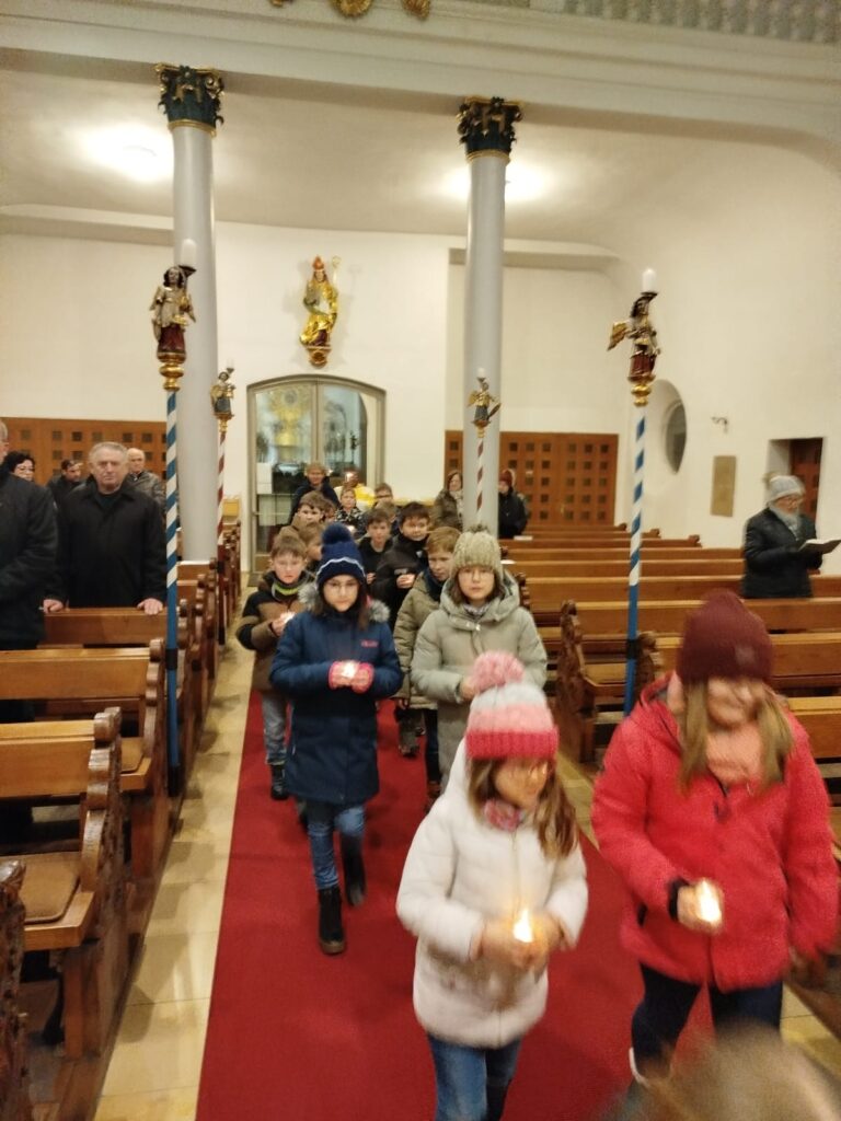 Passend dazu wurden zu Beginn die Kerzen für das kommende Jahr gesegnet. Anschließend zogen die Kinder der Gemeinde, darunter auch einige Kommunionkinder, gemeinsam mit den Ministranten und Kaplan Basil in einer feierlichen Lichterprozession durch die Kirche. Jede Kerze wurde schließlich an der Osterkerze abgestellt – ein sichtbares Zeichen für Christus, das Licht der Welt, das uns durch das ganze Jahr begleiten möchte.