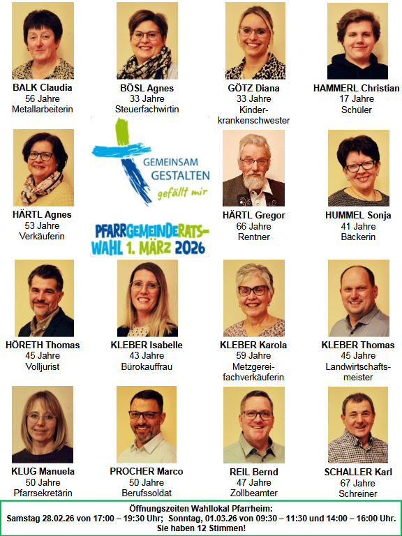 Am Sonntag, 1. März 2026, sowie bereits zu den Vorabendmessen finden die Pfarrgemeinderatswahlen statt. Wir wählen in unserer Pfarreiengemeinschaft sowohl für die Pfarrei Eslarn als auch für die Pfarrei Moosbach einen eigenen Pfarrgemeinderat.